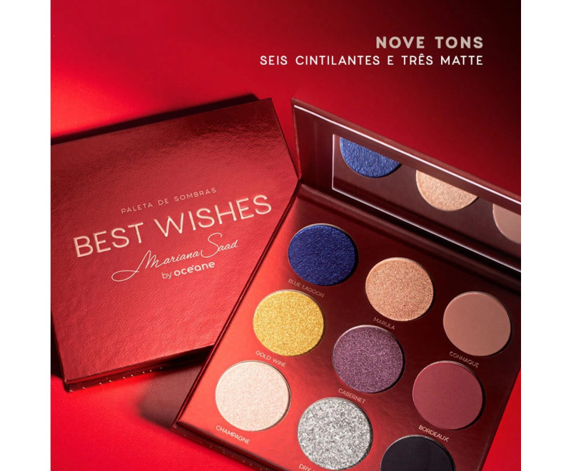 Inspirada nos drinks clássicos da mixologia mundial, a Paleta de Sombras Best Wishes Mariana Saad by Océane traz 9 tons super versáteis, sendo 6 cintilantes e 3 mattes, do Champanhe ao Conhaque, para te motivar a compor diferentes maquiagens e criar um olhar diferente, desde o básico do dia a dia até o mais completo e sedutor para arrasar em uma festa.