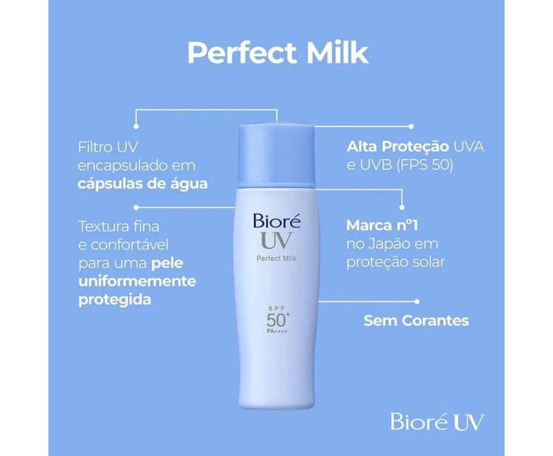 O Protetor Solar Bioré Perfect Milk FPS 50 tem rápida absorção e textura leve, proporcionando sensação macia e confortável durante e após a aplicação. Com proteção UVA e UVB, mantém a pele saudável e livre de envelhecimento precoce.