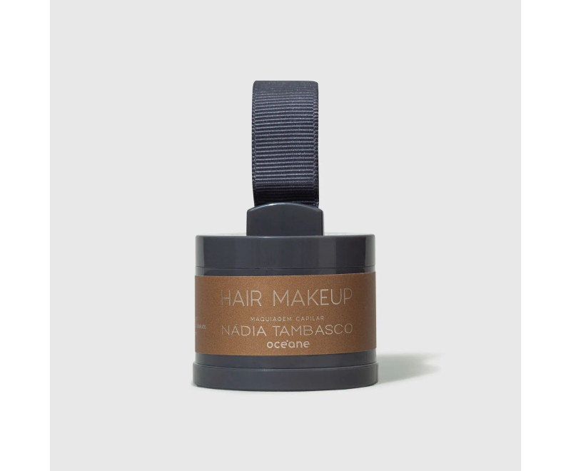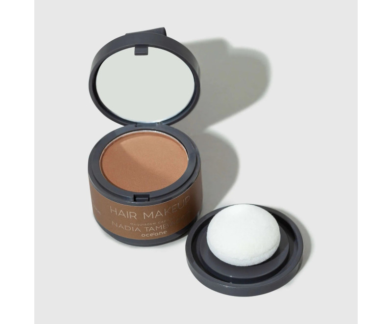 Maquiagem capilar castanho claro, da linha Nádia Tambasco by Océane, a Hair Makeup é uma solução temporária, e muito prática, para disfarçar a raiz branca ou mesmo cobrir falhas nos seus cabelos.