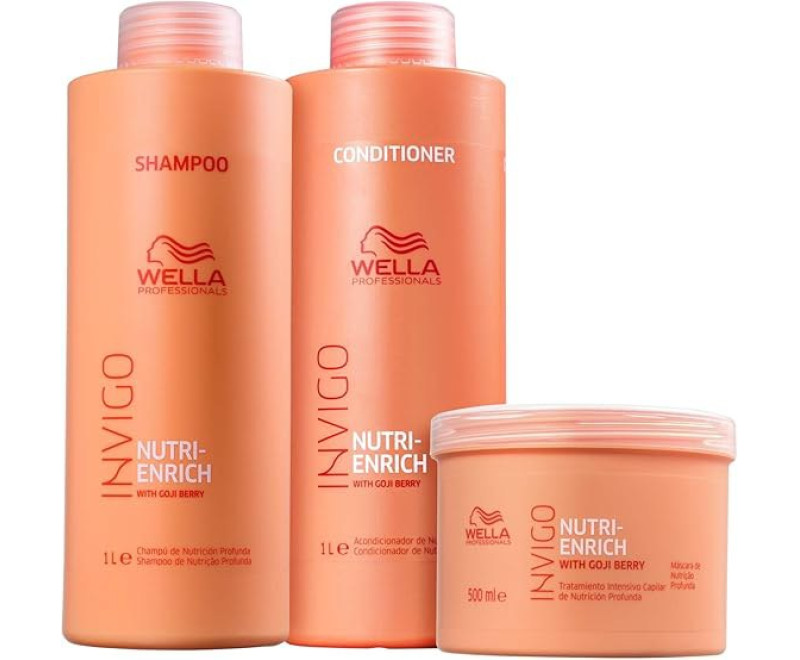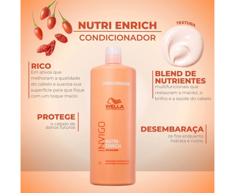 - 01 Wella Professionals Invigo Nutri-Enrich - Condicionador 1000ml: desembaraça e suaviza a superfície do fio para que fique com toque macio. 01 Wella Professioals Invigo Nutri-Enrich - Mask 500ml
