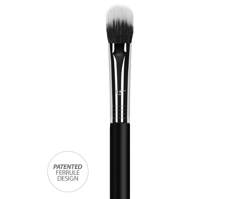 Pincel ideal para aplicação de produtos líquidos de cobertura leve para o rosto. Cerdas de fibra ótica e pelos naturais de cabra DAYTECH Soft Fibers/Hair, cabo de madeira com ponteira em cobre prata.