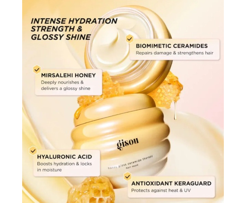 O que mais você precisa saber: Esta máscara é enriquecida com ceramidas fortalecedoras, mel Mirsalehi que aumenta o brilho e ácido hialurônico hidratante para uma terapia capilar rápida. Com uma textura rica, mas leve, proporciona cabelos mais suaves e brilhantes, mais fortes, macios e intensamente hidratados. Também é suavemente perfumada com a fragrância icônica do mel de flores silvestres de Gisou.