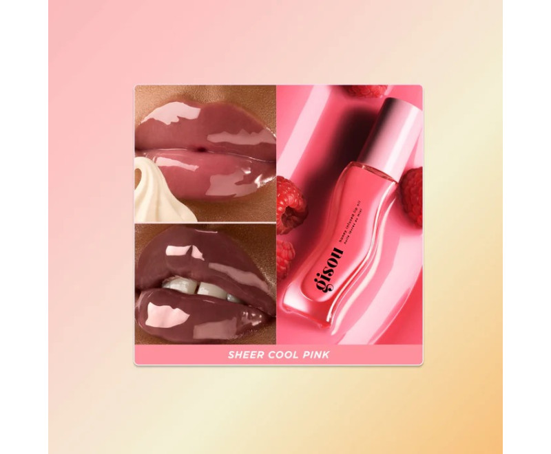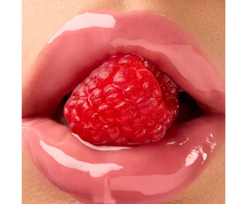 Um óleo labial rosa translúcido com nuances frias e um doce aroma de framboesa.
