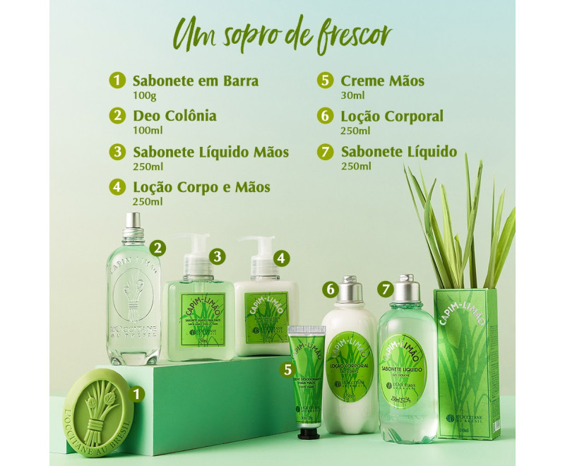 Sabonete líquido em gel com extrato de Capim-Limão que em contato com água se transforma em uma generosa espuma perfumada. Contém extrato de Capim-Limão.