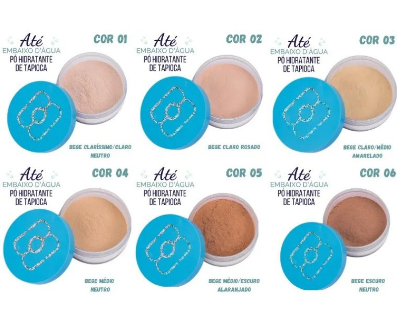 O Pó Hidratante de Tapioca Até Embaixo D’água já diz a que veio! Ele tem uma fórmula super especial, enriquecida com ÁCIDO HIALURÔNICO, que evita o ressecamento da pele e tem efeito prolongado, o que vai deixar um lindo acabamento na sua pele. A estrela desse pó é, claro, o AMIDO DE TAPIOCA! Que matifica a pele, sem retirar o viço natural da pele que tanto amamos.