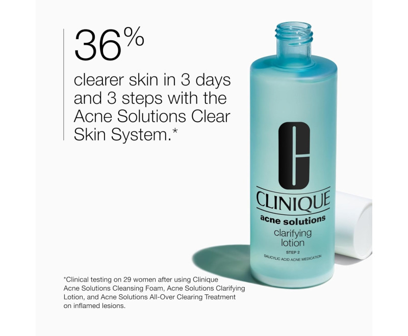 O tônico para a pele Clinique Acne Solutions Clarifying Lotion é o passo 2 na sua rotina de combate à acne. Ele é enriquecido com ácido salicílico para ajudar a limpar a pele. Passe-o sobre a pele com uma bola de algodão após a limpeza.