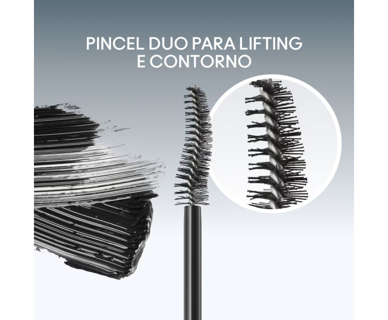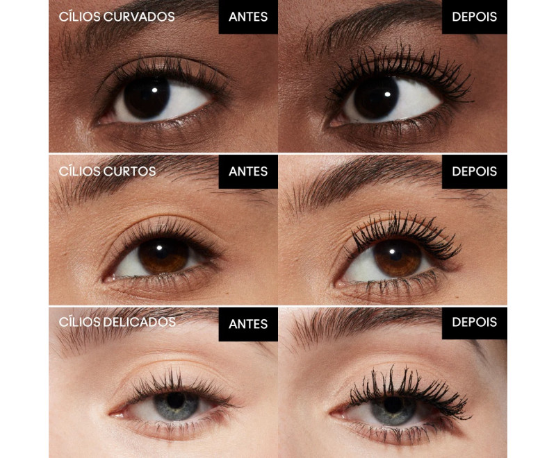 Curvatura e volume, efeito sem grumos, cílios alongados e em leque, levantamento instantâneo dos cílios, e cílios separados e definidos.