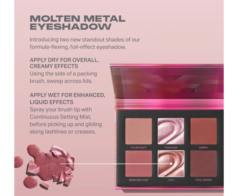 Atraia o público com esta curadoria tonal de tons suaves de rosa e cobre ricamente pigmentados, com 2 sombras Molten Metal, que podem ser aplicadas úmidas ou secas, além de 4 sombras matte complementares para efeitos melodramáticos e multidimensionais.