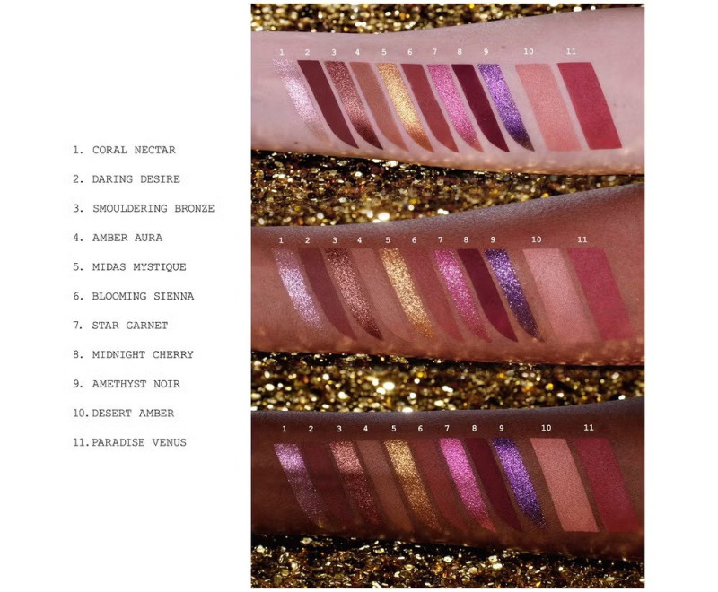 Abrace o fascínio surpreendente da Coleção MTHRSHP Bijoux Brilliance: Paleta multiúso para olhos e bochechas Jeweled Temptation, apresentando um tesouro de nove sombras para os olhos e dois Divine Blushes em Desert Amber e Paradise Venus. Esta gama cintilante de tons inspirados em pedras preciosas e blushes com acabamento semi-fosco e acetinado oferece uma combinação incomparável de cor aveludada opulenta e luminosidade metálica radiante. Cada tom, seja uma sombra suntuosamente saturada ou um blush brilhantemente misturável, transforma seu visual de elegância etérea em júbilo em tons de joias. Os blushes, com sua formulação em pó aveludado e sedoso, harmonizam-se lindamente com as sombras para looks que cativam e encantam a cada olhar. Jeweled Temptation permite adornar seu olhar e bochechas com um charme majestoso que é simplesmente irresistível.