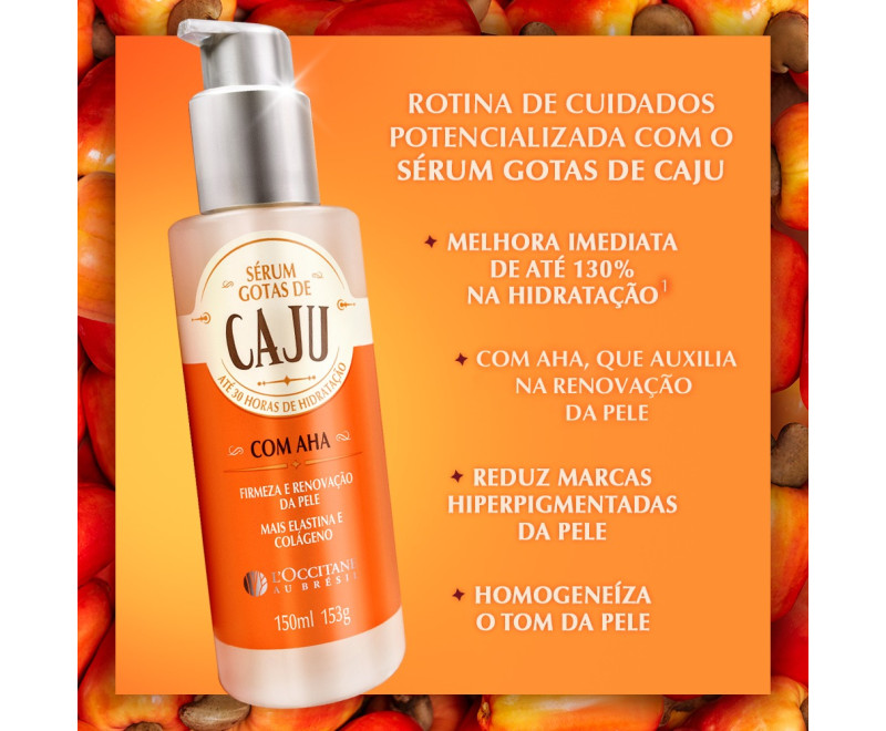 Este sérum corporal de textura leve e toque aveludado contém AHA e polipeptídeos vegetais, deixando a pele mais firme, renovada e iluminada¹ e oferece 2.3x mais hidratação², além de clarear áreas hiperpigmentadas do corpo. Se combinado com o Creme Hidratante Firmador Caju, promove um booster de hidratação e firmeza para pele¹. Contém extrato concentrado de Caju, conhecido por conter vitamina C, pela sua ação antioxidante e por preservar as fibras de colágeno e elastina. ¹Resultados visíveis em 28 dias; ²Teste instrumental;