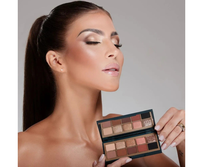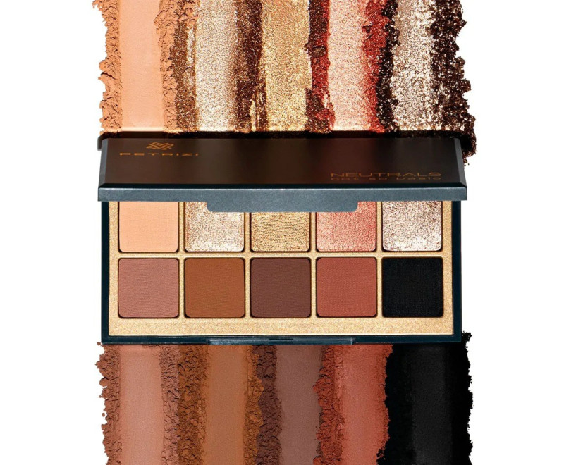 A paleta de sombras Petrizi mescla sombras foscas e cintilantes de altíssima pigmentação nos tons neutros mais essenciais para criar produções impactantes pro dia ou pra noite.