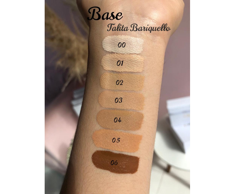 A TB BASE da Talita Bariquello conta com 7 tonalidades de bases, que garantem tanto tons para cores bem claras (00) como também para peles negras (06). Sua textura é glow, conferindo uma cobertura média, mas que permite camadas (você pode elevar a cobertura a alta usando mais que uma camada em sua pele) e de fácil espalhabilidade. Sua fórmula permite que a pele respire, não acumulando nas linhas de expressões, bem como controlando o brilho excessivo.