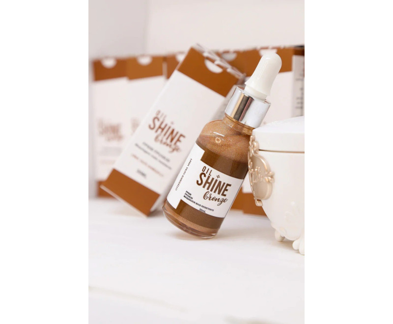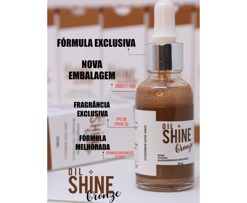 Oil Shine tem uma textura suave e partículas de brilho que iluminam a pele. Possui fator de proteção FPS50 e FPUVA30 e resistência à água e suor. o que prolonga a durabilidade do maquiagem e ainda protege contra os raios do sol. Pode ser usado no processo de pré maquiagem ajudando a preparar e hidratar a pele. Como também na finalização da maquiagem, para destacar pontos estratégicos. Sua fórmula é enriquecida com vitamina E e óleo de rosa mosqueta, que conferem ação antioxidante e antiaging, contém óleo de amêndoa, que é ideal poros e peles ressecados e que estão descansando. Contém também o Famoso e rico óleo de girassol, ideal para peles mistas. A parte que mais gosto, contém limonene, fragrância que segue a lei europeia de pessoas alérgicas, protegendo você alérgica a cheiro. contra quaisquer possível alergia. Possui ainda com ativos que promovem efeito soft focus e ajudar no disfarce óptico de imperfeições da pele.