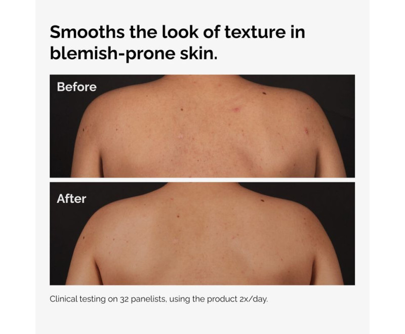 Um sérum corporal esfoliante para pele com tendência acneica que ajuda a minimizar a aparência dos poros, suavizar a textura irregular e uniformizar o tom da pele.
